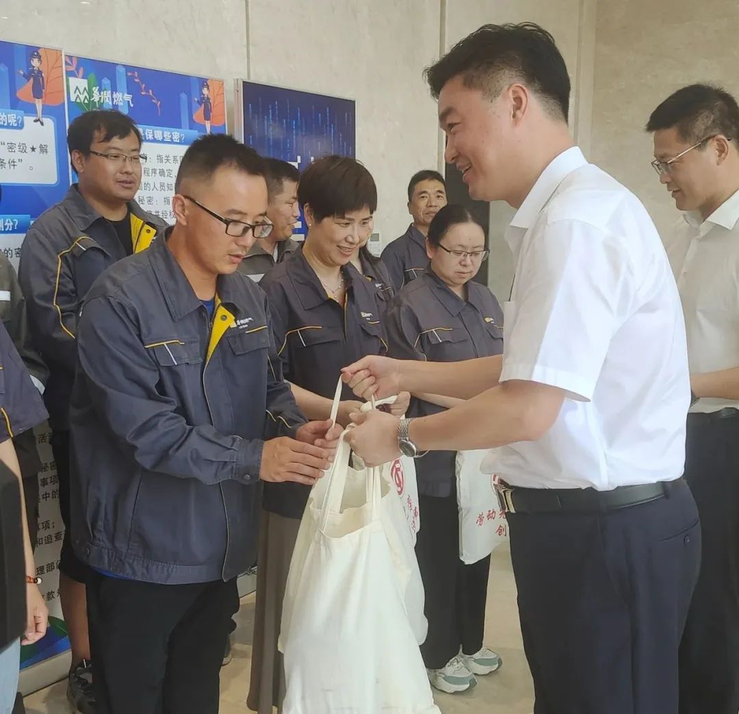 在启东华润燃气有限公司,蔡毅为一线职工送上防暑降温用品,对他们为全市经济社会发展作出的贡献及辛勤付出表示感谢和敬意。他叮嘱大家在坚守工作岗位的同时,注意休息、加强防范、保重身体。
