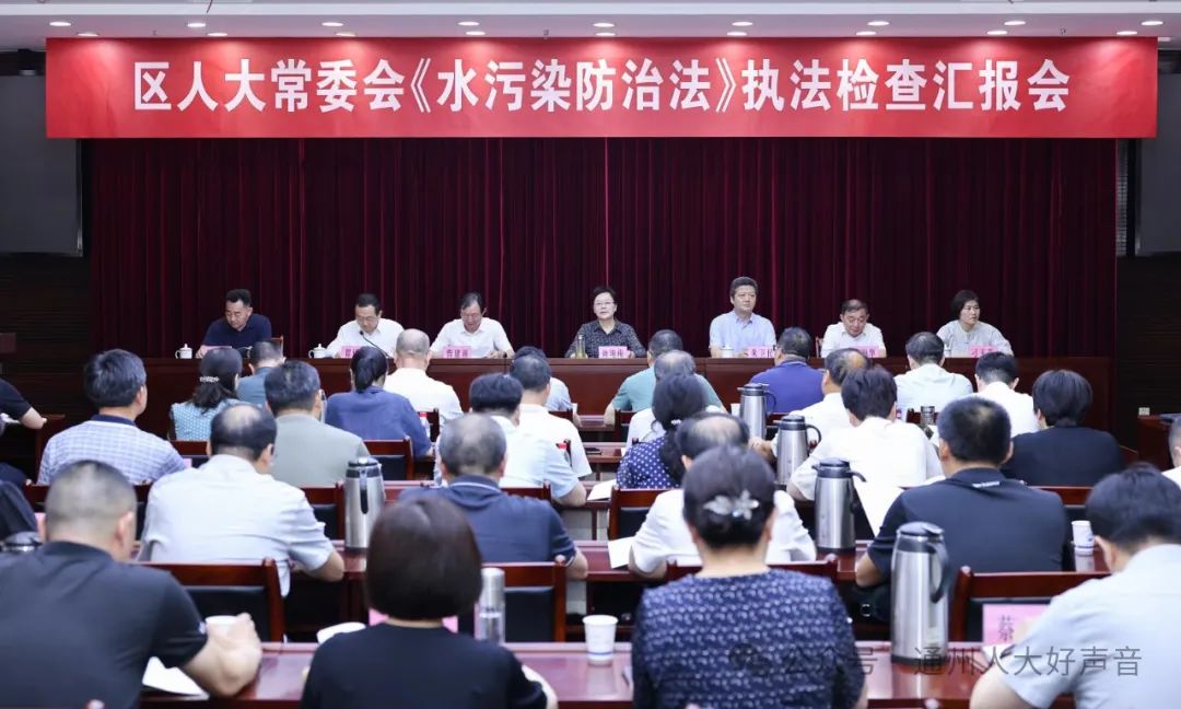 随后,区人大常委会副主任瞿祖平主持召开执法检查汇报会。通州生态环境局、区水利局、区交运局、区住建局等10个职能部门作了《水污染防治法》贯彻实施情况的汇报。瞿祖平表示,我区水污染防治成绩突出、成效明显,但仍然存在很多亟待解决的问题,源头治理工作任务依然艰巨,希望区政府及有关部门以执法检查为契机,进一步深化思想认识,树牢新发展理念,努力解决水污染防治中的突出问题;要严格对照法律规定,切实履行法定职责,加大执法监管力度;要坚持绿色发展,推进生态环境保护和产业发展同频共振,实现绿色低碳高质量发展;要加大《水污染防治法》的宣传力度,营造全社会“人人参与、人人监督、人人有责、人人尽责”的良好氛围。