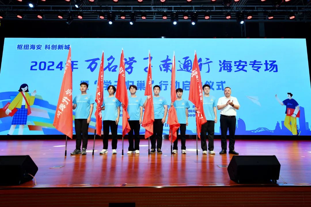 7月10日,2024年“万名学子南通行”海安专场暨“学子归巢”行动启动仪式在海安中学博雅剧场举行,市委常委、常务副市长王巧荣,市委常委、组织部部长、统战部部长钱旭东,副市长侯艳秋,海安中学党委书记、校长董裕华,市人社局党组书记、局长王晨,市委教育工委书记、市教育体育局党组书记、局长周树群,共青团海安市委书记范鼎等出席活动。