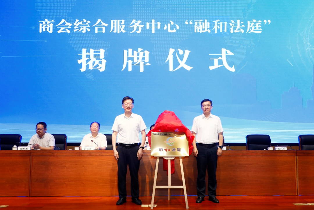 钱旭东、秦昌东共同为商会综合服务中心“融和法庭”揭牌。