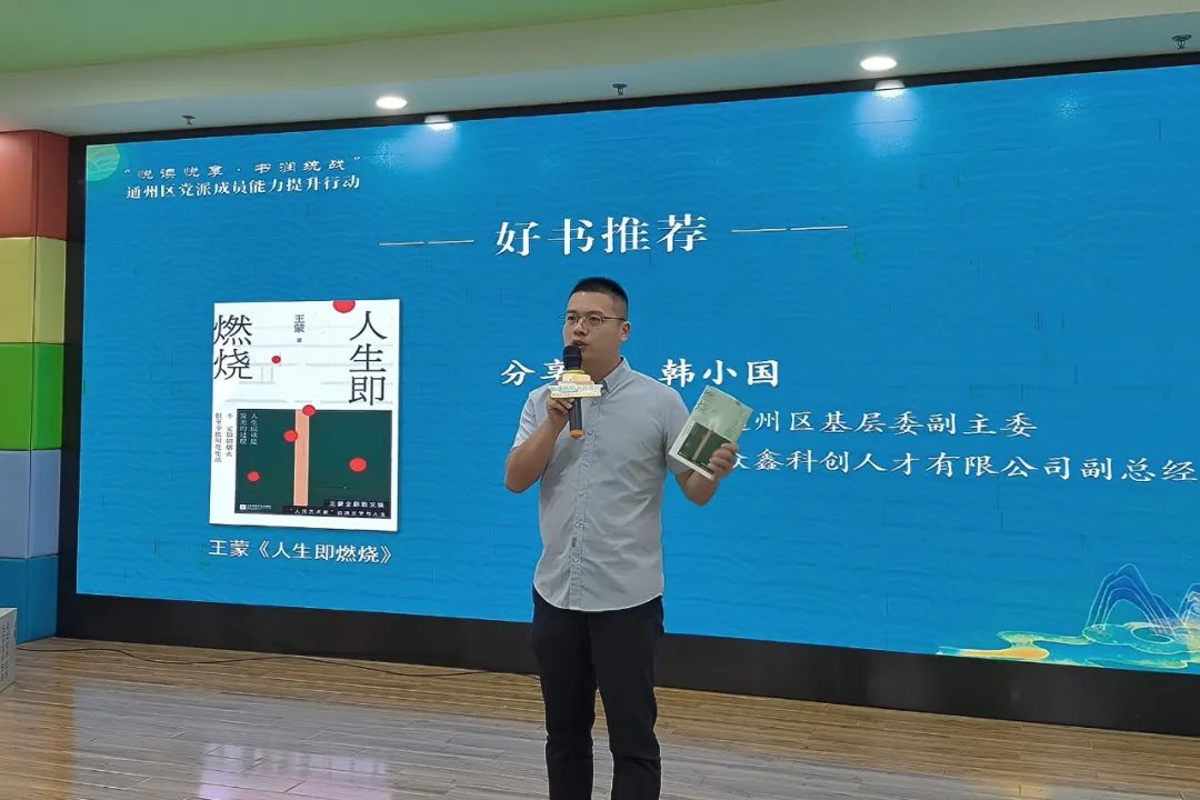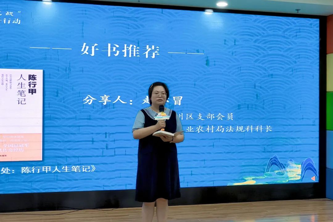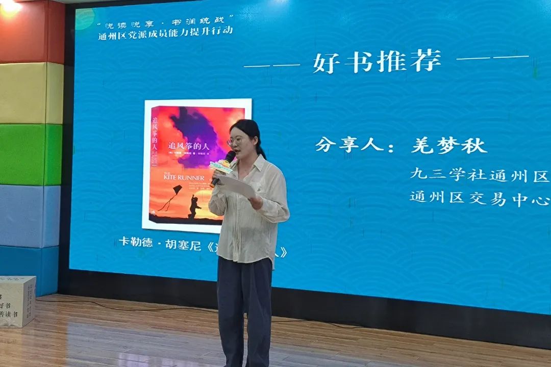 好书推荐环节,民盟通州区基层委副主委、南通众鑫科创人才有限公司副总经理韩小国,民建通州区支部会员、区农业农村局法规科科长赵亦冒,九三学社通州区基层委社员、区交易中心综合科科长羌梦秋,依次推介了王蒙的全新作品集《人生即燃烧》、陈行甲的人生笔记《在峡江的转弯处》、卡勒德·胡塞尼的长篇小说《追风筝的人》,分享阅读心得和感悟,带领大家遨游书海,品味书香。