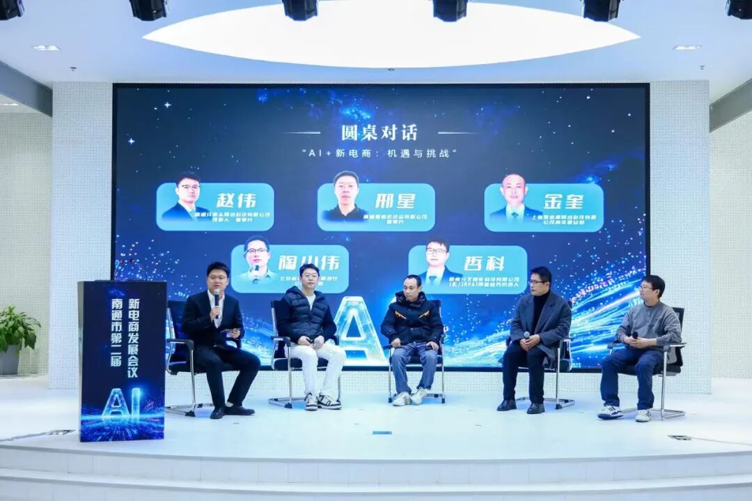 活动现场气氛热烈,陶永瑛、李晴、阮氏淮安从品牌升级、平台 AI 赋能与企业出海等维度分享对行业的洞察与实践经验。圆桌对话环节,南通找源头网络科技有限公司董事长赵伟、南通慧道纺织品有限公司董事长邢星等嘉宾,围绕"AI+ 新电商:机遇与挑战”主题,聚焦中小企业转型、赋能传统产业、生态构建等议题,探讨新电商产业的演进趋势与创新路径,绘就南通新电商高质量发展的美好蓝图。